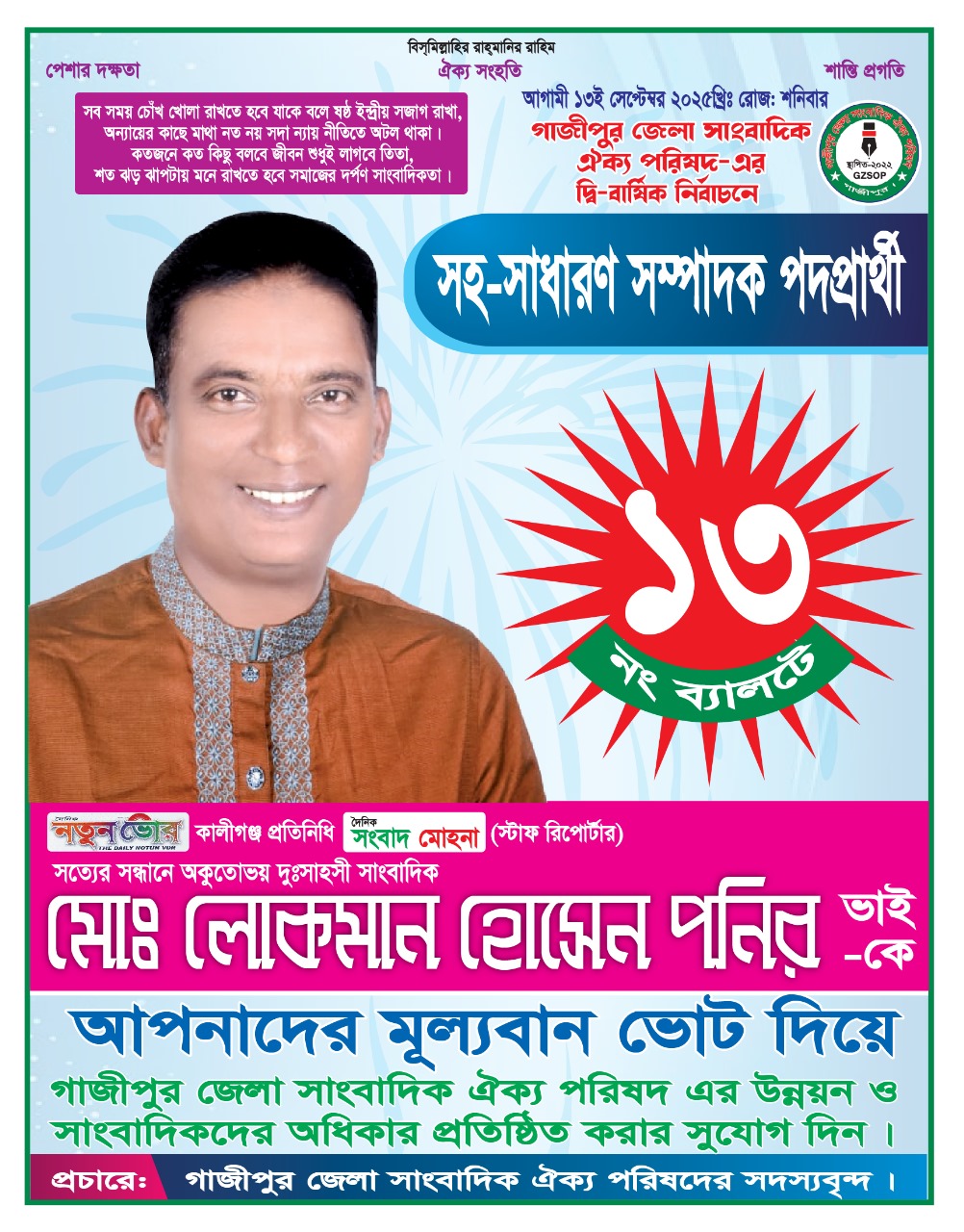 আগামী ১৩ সেপ্টেম্বর ২০২৫ গাজীপুর জেলা সাংবাদিক ঐক্য পরিষদের দ্বি-বার্ষিক নির্বাচনে আমি লোকমান হোসেন পনির সহ-সাধারন সম্পাদক পদপ্রার্থী, ব্যালট নং-১৩ সকলের দোয়া কামনা করছি।