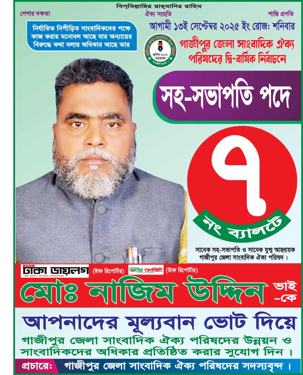 আগামী ১৩ সেপ্টেম্বর ২০২৫ রোজ শনিবার গাজীপুর জেলা সাংবাদিক ঐক্য পরিষদের দ্বি-বার্ষিক নির্বাচনে আমি মোঃ নাজিম উদ্দিন সহ-সভাপতি পদপ্রার্থী আমার ব্যালট নং-৭”ভোট চাই ভোটারের দোয়া চাই সকলের, আমাদের নির্বাচনে আপনি/আপনাদের উপস্থিতি একান্ত কামনা করছি।