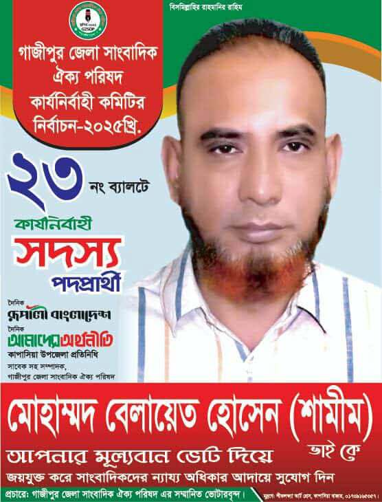 আগামী ১৩ সেপ্টেম্বর ২০২৫ রোজ শনিবার গাজীপুর জেলা সাংবাদিক ঐক্য পরিষদের দ্বি-বার্ষিক নির্বাচনে আমি মোহাম্মদ বেলায়েত হোসেন (শামীম) কার্যনির্বাহী সদস্য পদপ্রার্থী আমার ব্যালট নং ২৩” ভোট চাই ভোটারের দোয়া চাই সকলের। আপনার/আপনাদের উপস্থিতি একান্ত কামনা করছি।