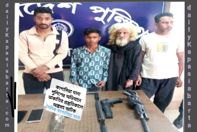 গাজীপুর জেলার কাপাসিয়া উপজেলায় ডাকাতির প্রস্তুতিকালে একটি প্রাইভেটকারসহ চার ডাকাতকে গ্রেফতার করেছে থানা পুলিশ। এসময় তাদের কাছ থেকে প্লাস্টিকের খেলনা পিস্তল, শর্টগান, চাপাতি এবং মাস্টার চাবিসহ ডাকাতির কাজে ব্যবহৃত বিভিন্ন সরঞ্জাম উদ্ধার করা হয়। পুলিশ সূত্রে জানা যায়, ২৯ মার্চ (রবিবার) রাত ২টার দিকে কাপাসিয়া থানার এএসআই নজরুল ইসলাম ও তার সঙ্গীয় ফোর্স টহল ডিউটি করার সময় গোপন সংবাদের ভিত্তিতে জানতে পারেন যে, উপজেলার চাঁদপুর ইউনিয়নের পাপলা সাকিনস্থ চেরাগআলী মোড়ে একদল ডাকাত ডাকাতির উদ্দেশ্যে শলা-পরামর্শ করছে। বিষয়টি ঊর্ধ্বতন কর্তৃপক্ষকে অবহিত করে তাৎক্ষণিকভাবে পার্শ্ববর্তী ডিউটিরত এসআই মোঃ মিলন মিয়া ও তার ফোর্সসহ ঘটনাস্থলে অভিযান চালান। পুলিশের উপস্থিতি টের পেয়ে ২/৩ জন অজ্ঞাতনামা ব্যক্তি দৌড়ে পালিয়ে গেলেও ঘটনাস্থল থেকে একটি ধূসর রঙের প্রাইভেটকার (ঢাকা মেট্রো-গ-১২-৬৪০২)সহ চারজনকে আটক করা হয়। গ্রেফতারকৃতরা হলেন ১. মোঃ সাগর (২৪), জেলা- শেরপুর (বর্তমান বাসা: মধ্য ছায়াবিথী, গাজীপুর সদর)। ২. মশিউর রহমান জুয়েল (৩৫), জেলা- টাঙ্গাইল (বর্তমান বাসা: উত্তর ছায়াবিথী, গাজীপুর সদর)। ৩. নওয়াব আলী (৬০), জেলা- গাজীপুর (বরুদা এলাকা)। ৪. সাব্বির (১৫), জেলা- ময়মনসিংহ (বর্তমান বাসা: বরুলিয়া, গাজীপুর সদর)।